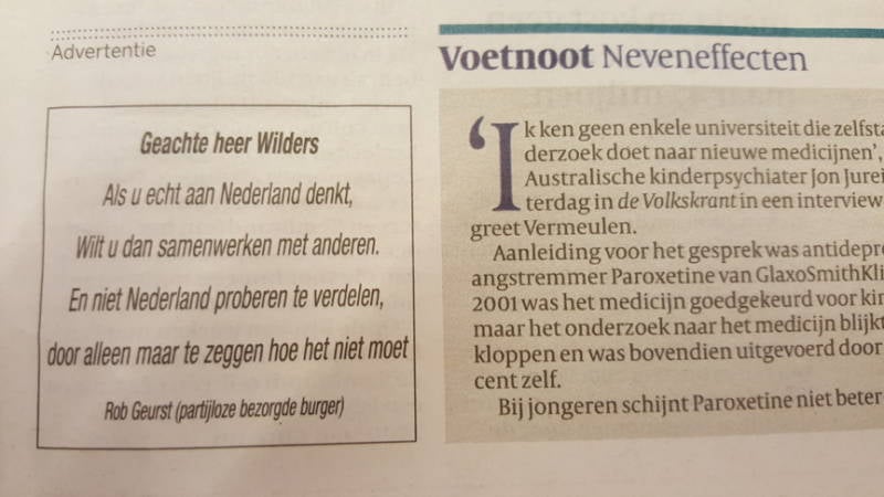"Sehr geehrter Herr Wilders. Wenn Sie wirklich der Niederlande denken, werden Sie arbeiten mit anderen. Und versuchen Sie nicht zu teilen Niederlande, nur um zu sagen, wie es nicht sollte. Rob Geurst (überparteiliche betroffenen Bürger)."