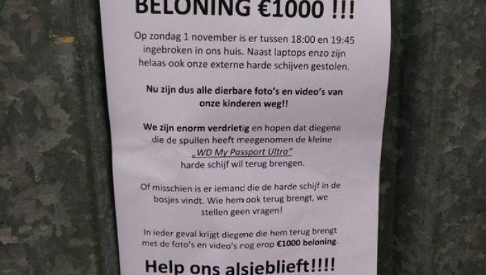 „Die harde schijven zijn misschien een paar tientjes waard, maar wat erop staat, is voor ons onbetaalbaar. Ik heb verhalen gehoord dat dieven vaak de harde schijven laten liggen bij een inbraak, maar bij ons dus niet. Misschien helpt die 1000 euro en krijgen we een harde schijf terug of stuurt de dief ons een link naar een plek online waar we wat foto's en video's terug kunnen vinden. Ik ben met alles blij. Misschien zijn de harde schijven weggegooid en vind iemand ze ergens. Ik weet het niet, maar ik moet iets doen.”