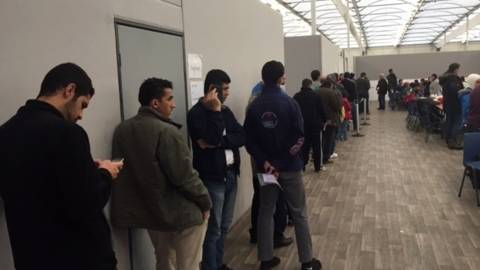 Sommige asielzoekers dragen blauwe hesjes. Zij zijn vrijwillig bezig het kamp schoon te houden. Eet- en recreatiezalen worden gedweild. Dat geldt ook voor de wasruimten, de wc's en douches.