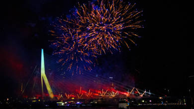 De vuurwerkshow bij de Erasmusbrug ging gewoon door. Er kwamen tienduizenden mensen op af.