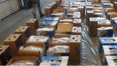 De drugs zaten verstopt in dozen met bananen uit Ecuador. Drie mannen zijn opgepakt.