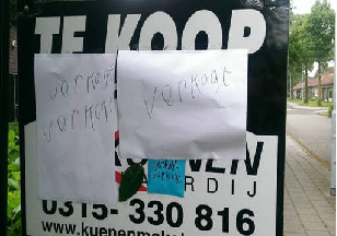 De 7-jarige heeft haar buurvrouw eerst duidelijk gemaakt dat ze absoluut naast haar moest blijven wonen, vertelt de moeder van Doris aan De Gelderlander. Dat bleek niet te helpen, waarop het meisje potentiële kopers om de tuin wilde leiden door heel groot ,,verkogt'' op het te koop-bord te zetten. Doris' papiertjes hebben helaas de regen van de afgelopen dagen niet overleefd.