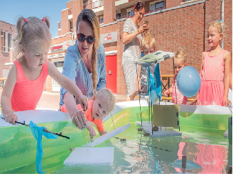 Aan het Van Tijnplein in Naaldwijk kunnen kinderen helemaal losgaan op de beste kinderhits en bouwen ze zelfgemaakte bootjes van piepschuim. Yentle (2) en Daly (1) de Hoog spetteren met hun piepschuimbootje in het grote opblaaszwembad.